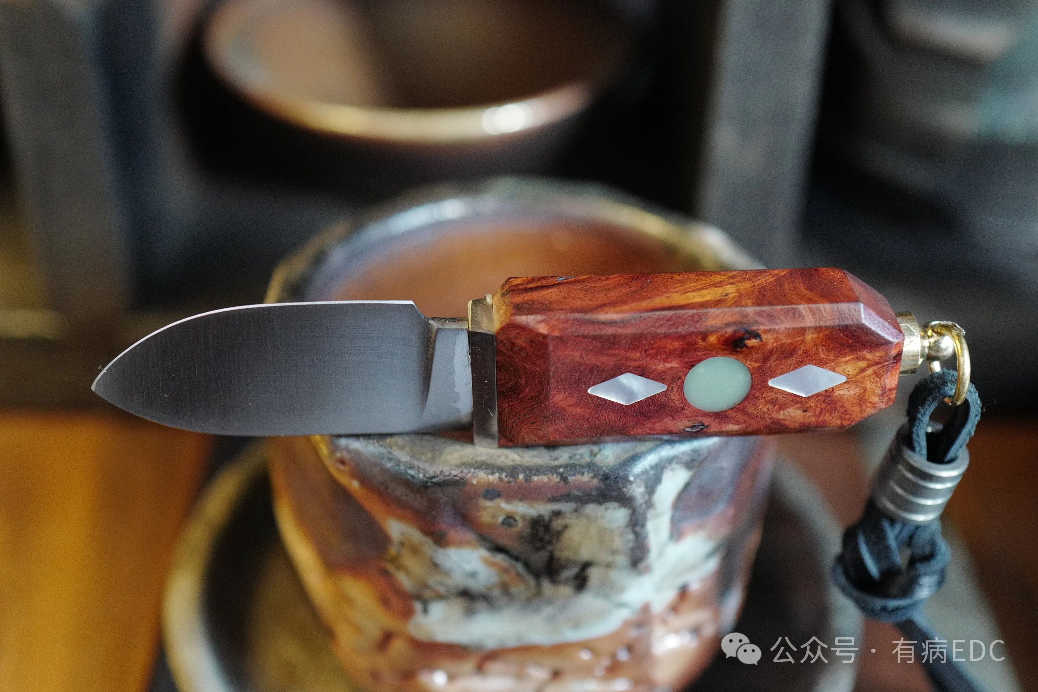 Adopting mammoth molar and Burmese rosewood gall handle, Mosaic Damascus adopts inlay technology and uses Swedish 15n20 and American 1084 imported steel with a hardness of 64hrc.